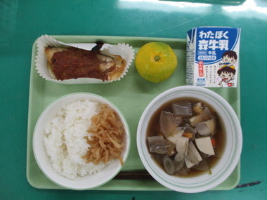 今日の献立 ・ごはん 炒めたくあん ・サバの麦味噌焼き ・けんちん汁 ・みかん ・牛乳 |