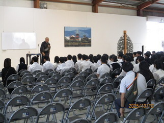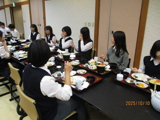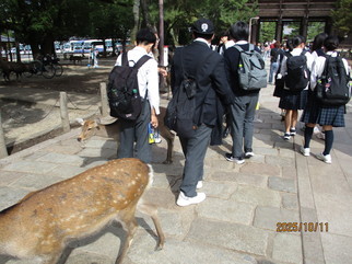 1 日目 東京駅で出発式を行い、新幹線に無事に全員が乗車しました。新大阪駅からはバスを使ったクラス行動で薬師寺、法隆寺を見学しました。薬師寺ではお坊さんからお寺についてのお話をしていただきました。宿舎の信貴山では夕食をまとまって食べました。おいしくて量も多く、お腹いっぱいになったことでしょう。
