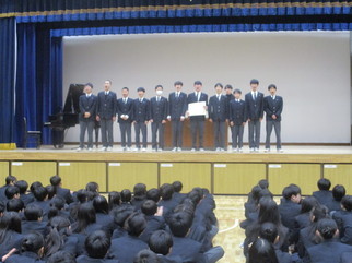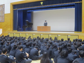 令和 7 年度 第 2 学期 終業式 2025年12月25日 第 2 学期 終業式が行われました。 2 学期終業式が行われました。いよいよ明日から冬休みになります。校長先生からはイソップ童話「北風と太陽」の話を通して「力ずくよりも“あたたかさ”や“やさしさ”のほうが人を動かす」という教訓を生徒達に伝えました。SNS 等のやりとりでトラブルがおきないように、充実した冬休みを過ごしていきましょう。