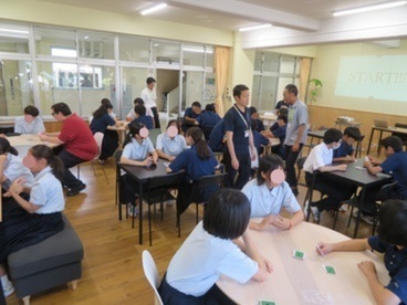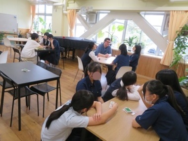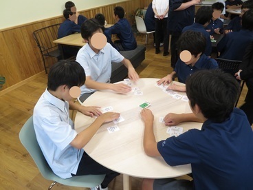 ロバートの英会話教室 2025年9月5・8・9日 国領駅前の「あくろす」から外国人講師のロバートさんに来ていただき、MORIルームで英会話教室を開いてくださいました。 グループでカードを順番に引き、カードに書いてある英文の質問に英語で答えるゲームをしました。 英語で答えるとポイント獲得です。みんな楽しく英会話をしながらポイントゲットしていました。