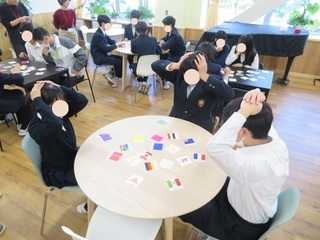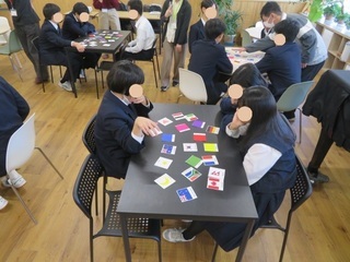 英語ミニワークショップ 2025年11月14日(金) ICU大学生による英語のミニワークショップが行われました。 ICUの大学生が、11/29・12/6に本校で2年生対象で実施する英語のワークショップ「English Adventure」の宣伝のために来校し、そのデモンストレーションとしてミニワークショップを行いました。 英語カルタとして、英語の質問にあてはまる色や国旗などのカルタを取り合うゲームを行いました。短時間ながら英語での質問を真剣に聞き取りながら楽しく取り組んでいました。