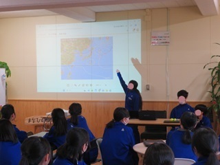 天気予報発表(2年生 理科) 2026年1月19(月)・20日(火) 模擬天気予報をTV番組形式で発表しました。 授業で発表した班の中から、各クラス代表の班が発表を行いました。 ある1日の天気をもとに、天気図を使って予報を伝えたり、現地レポーターになりきって様子を伝えたりしました。 各班とも個性豊かな発表を行っていました。