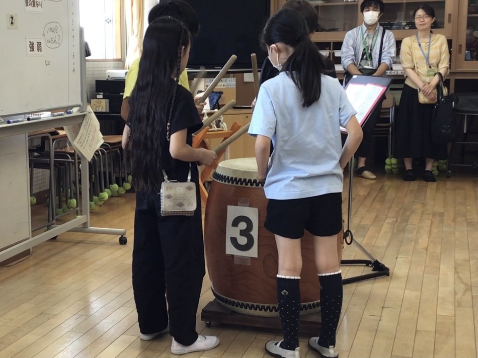 6年生はゲストティーチャーをお招きし、音楽発表会で演じる和太鼓の学習を行いました。