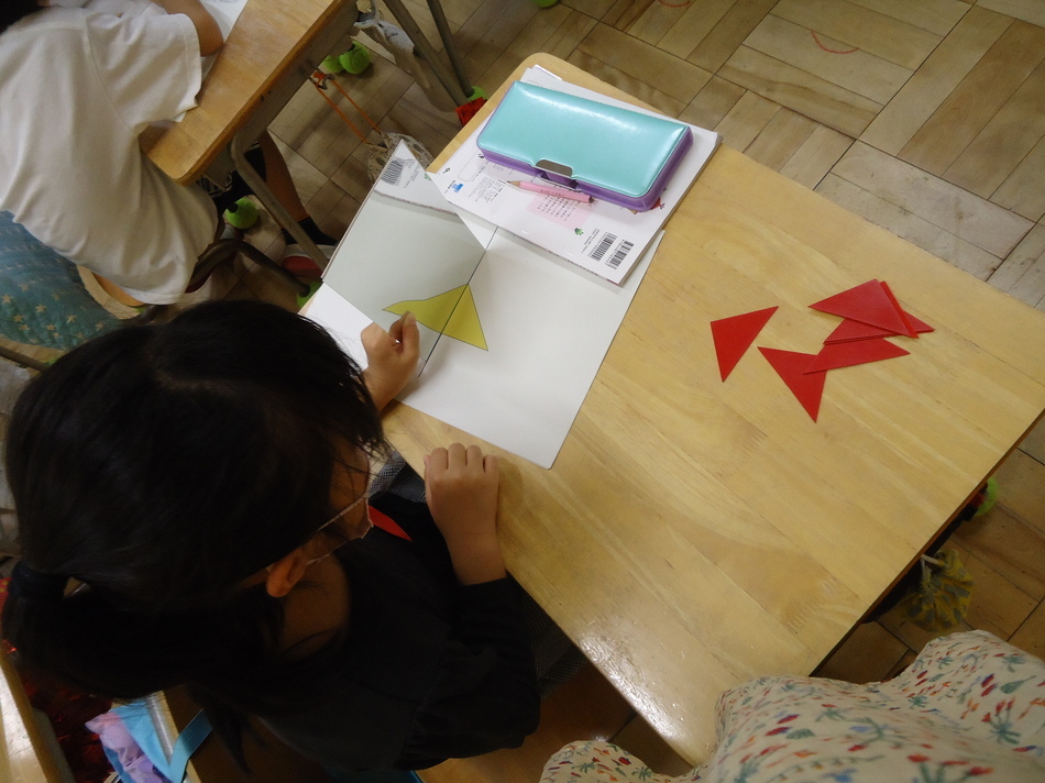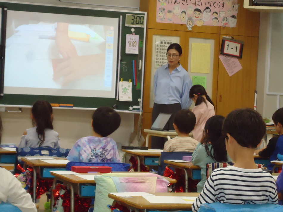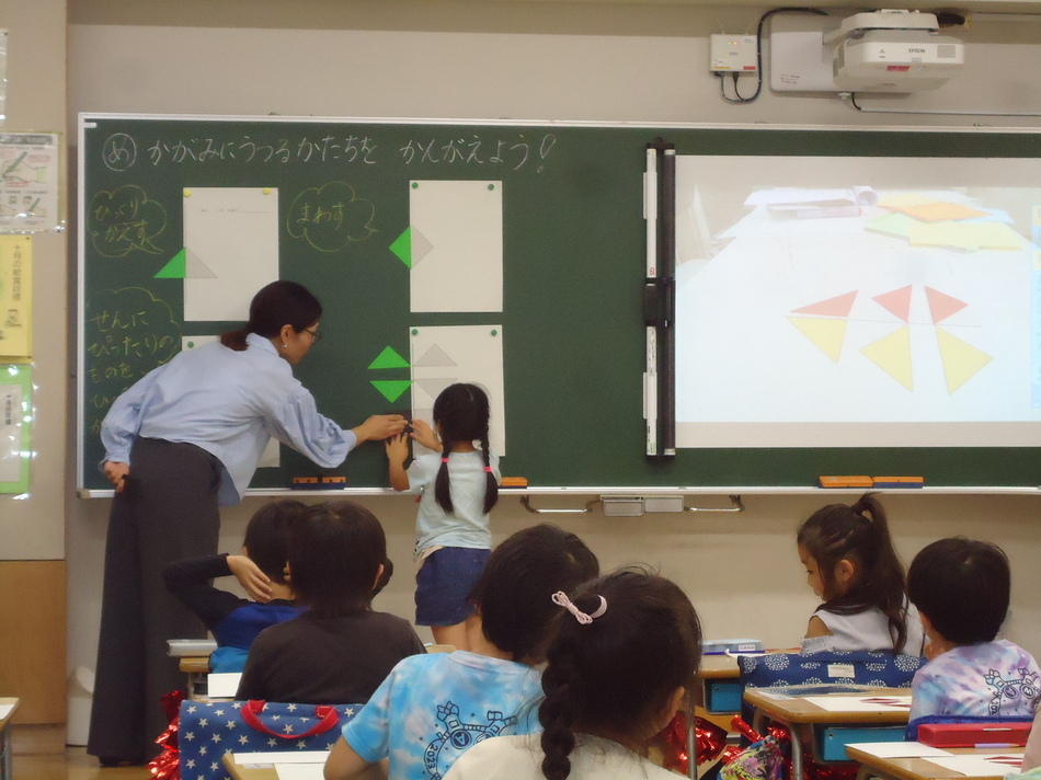 1年生の教室に 2023年10月19日(木) 第5学年の先生が1年1組へ算数を教えに来てくださいました。 いつもと違う先生に教えてもらうので緊張気味の1組さん。 と、思いましたが、あっという間に楽しい時間に早変わり! 鏡(落としても割れない素材)を使って形の学習をしました。 一つの形からいろいろなものに見立てたり、同じ形に並べたりと 楽しく学習を進めることができました。