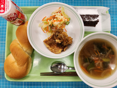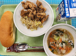 くじらの竜田揚げ キャベツソテー 昔のワンタンスープ