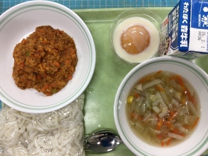 ソフト麺ミートソース たっぷり野菜スープ おかしな目玉焼き