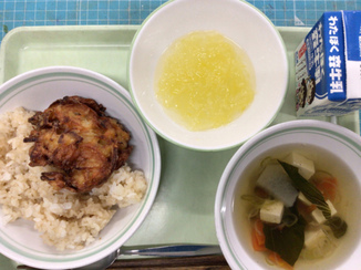 4月18日 しょうがごはん かつおのあげに ぐるに ゆずはちみつゼリー