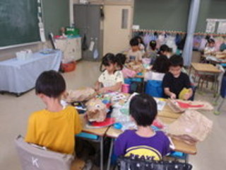 1年 図工 2025年9月8・9日 パクパックン 「さあ、先生の手を見て。何の動きに見えるかな?」 親指とそれ以外の指を動かして見せます。 「ワニだ!」「カエルにも見えるよ。」「恐竜…」 想像がふくらんだところで、制作に入りました。 茶色の紙袋に、目や飾りなどを自由に張り付けていきます。 「今週は途中まで。来週続きをします。」 という先生の声に、 「えーっ、もっとやりたい!!」 意欲満々の1年生です。