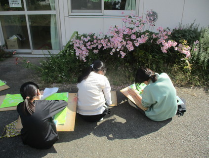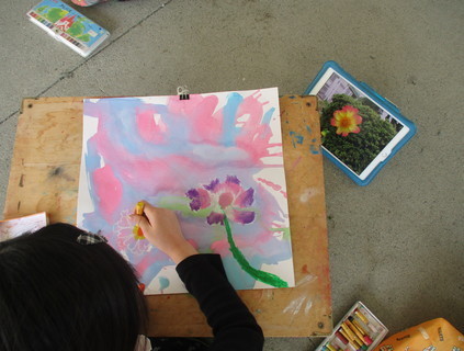図工の学習でも、3年生が校庭の花々を観察してクレパスで描き、花びらの色や形の違いを丁寧に表現していました。タブレットで花の写真を撮っておくことで、花びらや茎の細かな形や色の違いまでじっくりと観察することができました。