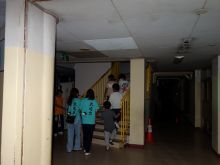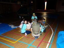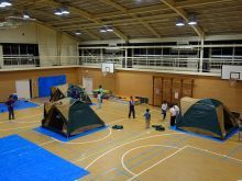 体育館に寝泊まりするためのテントを張りました。その後に夜中の校舎内を散策しました。