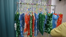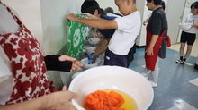 6年1組が、ふれあい給食事業に参加されている高齢者の方たちとしぼり染めを行いました。