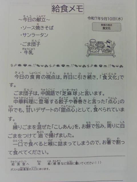 9月10日 給食ニュースはいつ読むの? 【献立】 ・ソース焼きそば ・サンラータン ・ごま団子 ・牛乳 杉森小学校では、食育の一環として給食ニュースを「いただきます」の前に教員が読むことにしています。 食べる前に今日の給食に関する知識を得ることで、給食をさらにおいしく楽しくいただくことができるからです。 今日は、ごま団子を食べる際の注意事項も伝えました。子どもたちはごま団子を、食べ方に気を付けておいしくいただいていました。