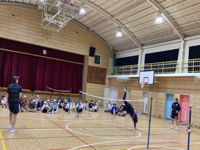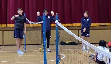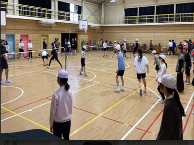 6年生 セパタクロー体験 令和8年2月12日 セパタクロー日本代表の3選手 市川選手 濱田選手 恩田選手に来ていただきました。 初めて行うスポーツに戸惑いながらも、楽しみました。オーバーヘッドキックのようなアタックを見せてもらい、みんな大拍手でした。最後は、世界選手権とアジア大会で獲得した金メダルと銅メダルも見せてもらいました。