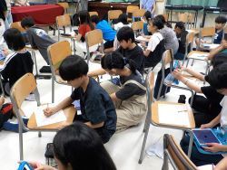 その後、個々でタブレットに流れる曲をもう一度聴きながら、自分の感じたことをワークシートに書き込みました。