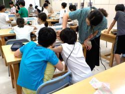 そこで、学習ボランティアの方々にも手伝ってもらい、ミシンの準備をていねいに行いました。