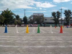 並んだあとはいよいよ走ります。走るときに気をつけたいのは、ゴールする前で走りをゆるめないことです。そのために、ゴールの先にコーンを置いてコーンをタッチするまで全力で走ります。