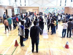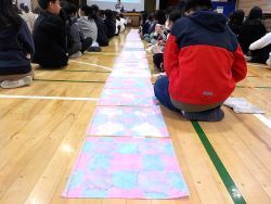 できあがった一枚一枚の正方形の布を各学級でつなぎ合わせて長い一枚の帯のようにします。