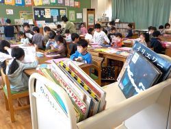 今、図書室は冬休みの特別貸し出し中です。1年生は3冊まで借りることができます。ふだんよりたくさん借りることができるので、みんな借りる本を夢中になって探します。友だちはどんな本を選んだのかも気になる様子です。また、「この本おもしろいよ」と他の子に勧める子もいます。ほとんどの子は3冊選ぶことができました。