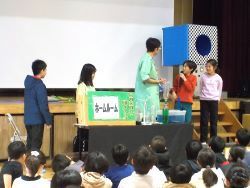 子どもたちに、楽しいトークとパフォーマンスを用いて、科学の楽しさとこれからの地球環境を考え、私たちがどのように地球に優しい生活していけばいいのかを教えていただきました。