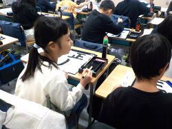 まずは、これまでの復習として習字用具の置き方、「とめ」「はね」「はらい」の書き方を動画で確認しました。