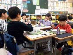 1年生の教室では「チキンがおいしそう」「コーヒー牛乳が楽しみ」などと話していました。