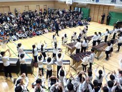 合奏「情熱大陸」では、打楽器の軽快な演奏の後、手拍子でこのリズミカルな曲を表現します。演奏中は指揮をよく見て速さとリズムを合わせました。
