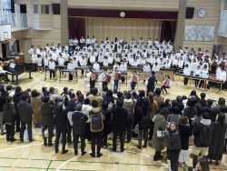 合唱「宝島」が始まりました。ソプラノ、アルトがお互いの声を聴き合って伸び伸びと表現しています。歌い終わって笑顔がこぼれる子もいます。