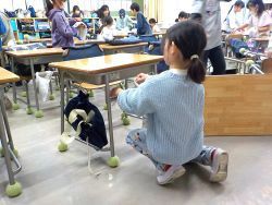 1年生の教室では、床を雑巾できれいに水拭きしていました。