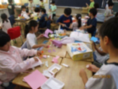 また、牛乳パックやトレー、ペットボトルキャップを使って、走る車を作りました。廊下や教室などで車を走らせて遊んだり、画用紙や名前ペンを使ってデコレーションしたりして楽しみました。