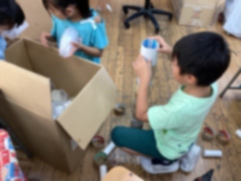 1学期から、ご家庭から寄付していただいたガムテープやトイレットペーパーの芯、カップ等を使って、積む・転がす・並べるなどの遊びを試しました。